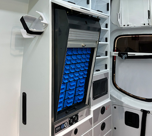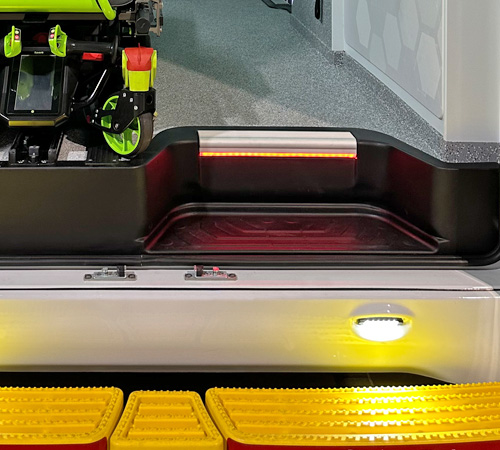As an option, the interior lighting of the cabinets with transparent, translucent or opaque fronts facilitates the work of the technicians when accessing the material stored in the vehicle.
