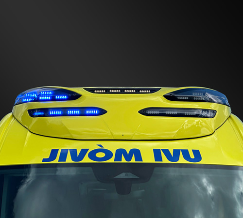 Following the range's design philosophy, the RLAJ2 is strategically located at the top rear of the ambulance. This elevated position ensures that the opening of the doors never obstructs the emergency lights, guaranteeing a rear and posterior side light coverage that is always visible. The system comes standard with powerful area lighting (work light) and offers, as an option, an amber directional light bar or an innovative two-tone system, which adapts the color of the lights depending on whether the vehicle is stationary or in motion.