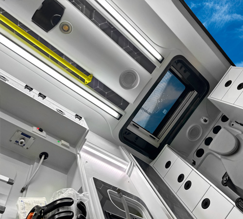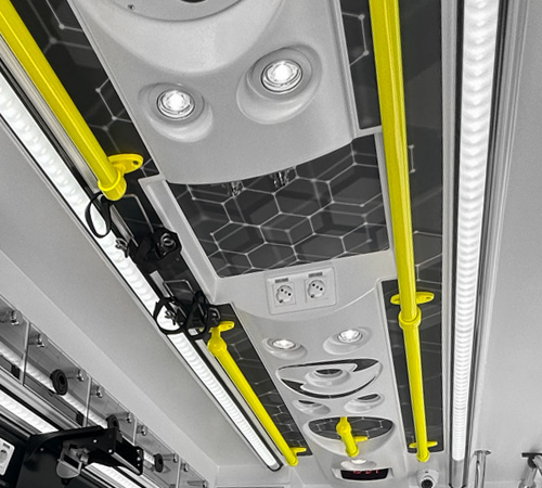 The choice of the base color combined with the roof, seats and other elements allows the interior tone to be adapted to the corporate image of the emergency service.