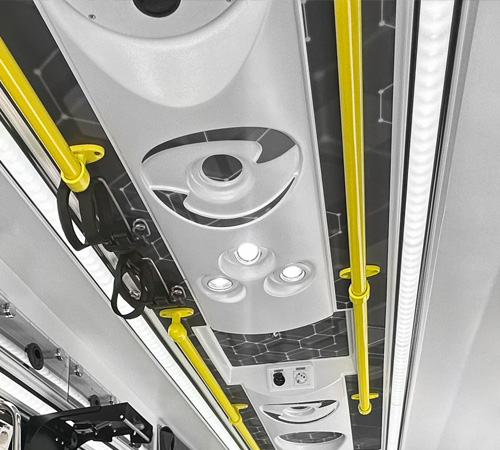 Each optical unit integrates 3 high-visibility RLA FL3 or RLA FL6 dual-color strobe lights, one of which is angled to extend the projection range. With an additional side light on both sides, a full 180º coverage is achieved. The dual-color lights switch to amber when the vehicle is stationary and the doors are open. For rear work lighting, a fourth white RLA FL6 light is incorporated.