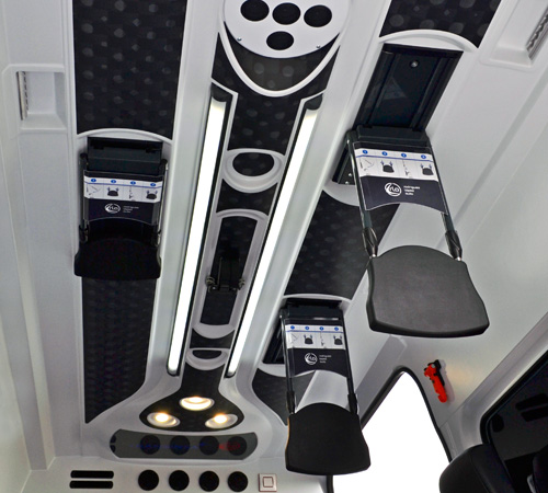 This system is incorporated for markets and types of vehicles where the use of this type of seats is allowed. It incorporates an anatomical backrest and a three-point seat belt for each seat and a support for a spinal board. The table top can be used in an emergency to transfer a second patient lying on the bench using special belt anchors.